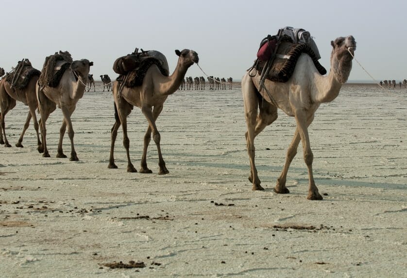 Frühe Abfahrt zum Dallol. Am Fuße dessen ca. 30-45 Minuten Wanderung zu den bunten Salzpfannen. Wanderung in der Region. Rückfahrt nach Hamed Ela am Nachmittag. Am Abend begleiten Sie wandernd eine Salz-Karawane, die das Licht des Mondes zur Fortbewegung nutzt. Abendessen und Übernachtung im Zelt.