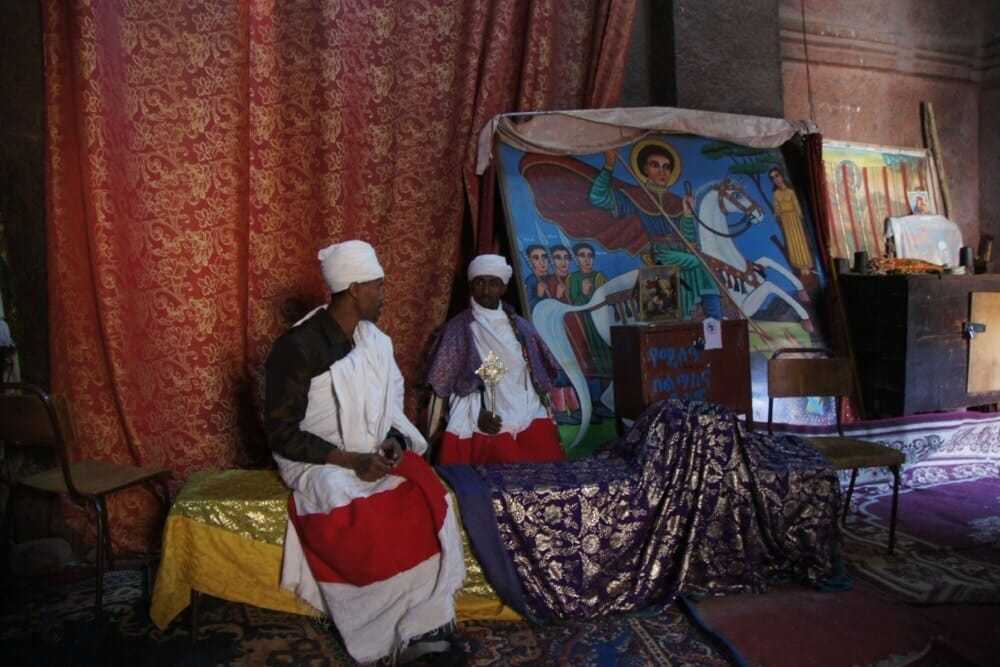 Transfer zum Flughafen und Weiterflug mit Ethiopian Airlines nach Lalibela. Bei Ankunft in Lalibela, Transfer zum Hotel, Zimmerbezug und Mittagessen. Am Nachmittag Besichtigung der ersten Gruppe der Felsenkirchen von Lalibela, die in den Jahren 1180-1220 unter König Lalibela entstanden. Bis heute sind die Kirchen bedeutende Orte des christlichen Glaubens und wurden nicht selten als „Achtes Weltwunder“ bezeichnet. Sie besichtigen die in den Fels geschlagenen Kirchen Bete Medhanealem, Bete Maryam, Bete Meskel, Bete Denagil und die Zwillingskirchen Debre Sina und Bete Michael sowie die Selassie Kapelle. Als krönender Abschluss Besichtigung der kreuzförmigen Georgskirche (Bete Giorgis), die als Juwel der Anlage und letztes Werk König Lalibelas gilt.
